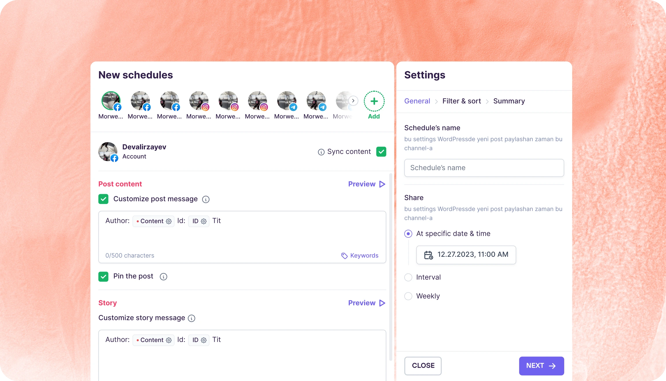 Our custom social media auto poster & scheduler integrates with 21 social media networks and services. Choose the WordPress category, define the posting times and watch the magic happen. And, you can create an unlimited number of combinations. For example, you want to share smartphone news everyday at 2 o’clock? Done; share headphone reviews Thursdays at 6? Done.